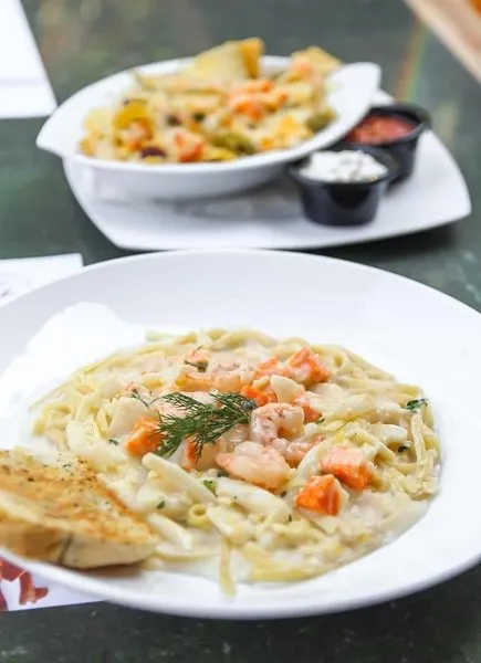 Homemade pasta tossed with shrimps, calamari, crab meat, parsley and parmesan cheese smothered with creamy sauce