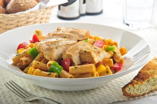 Garlic grilled chicken breasts served on top with diced tomato, colored peppers, mushrooms and penne in spicy pink sauce