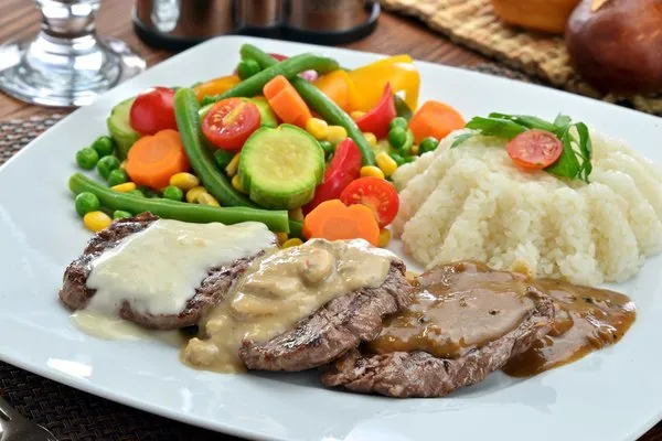 All plates are served roasted potato cubes marinated mushroom with herbs, mix green, your choice of tea or coffee