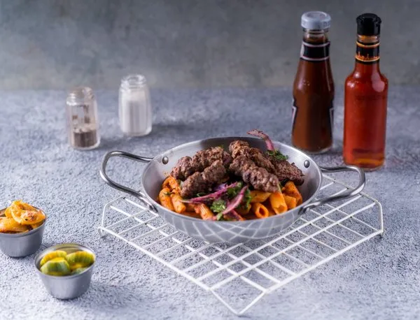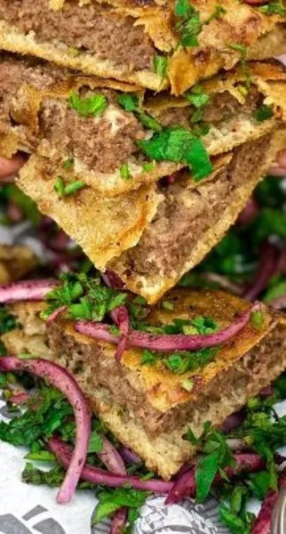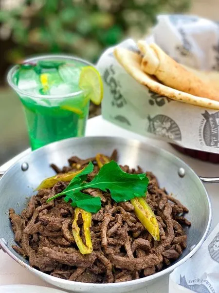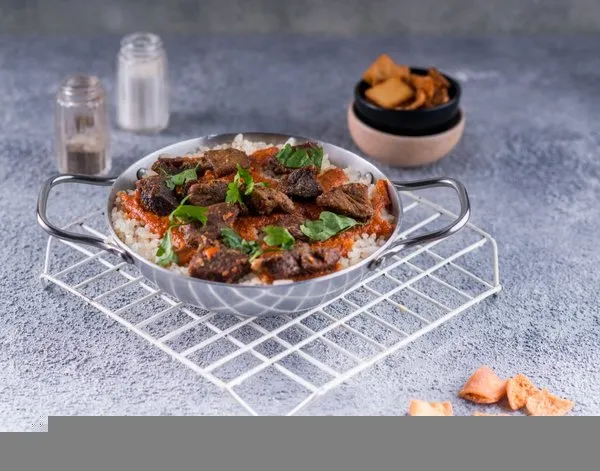 Fattah with Baladi MeatRoasted bread, rice, baladi sauce, pan fried meat and baladi tasha |