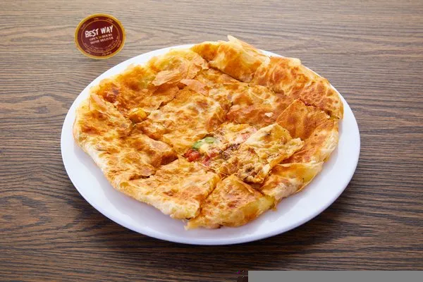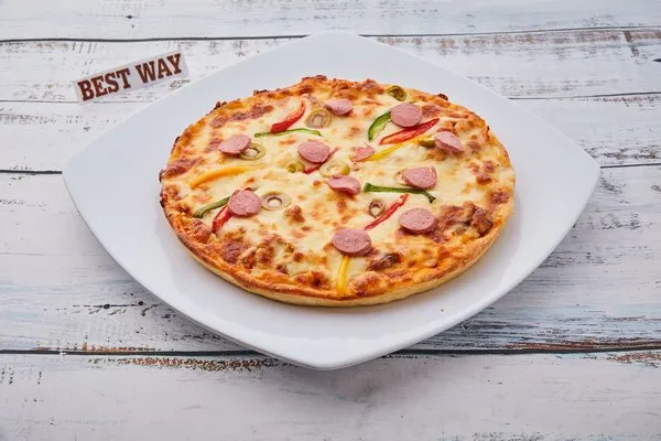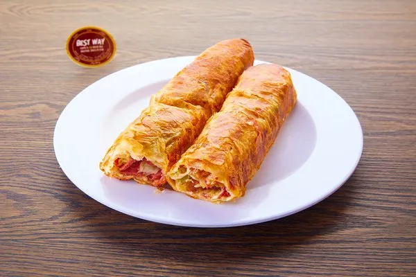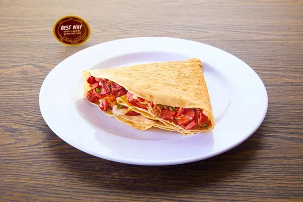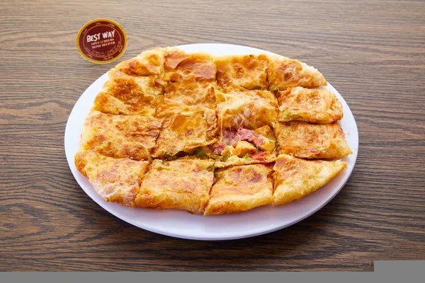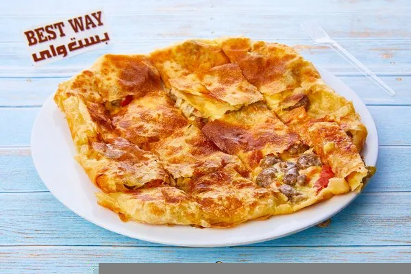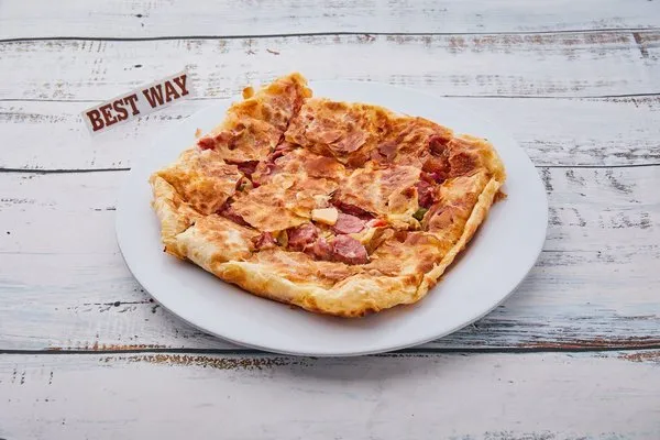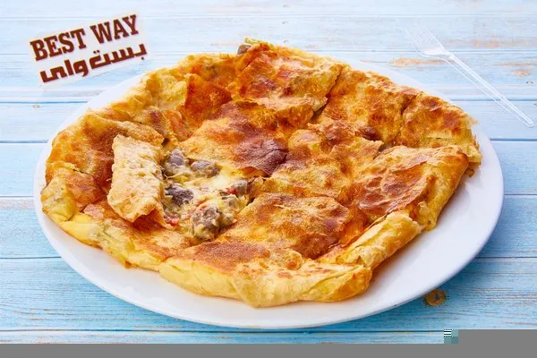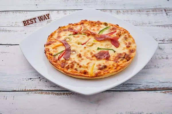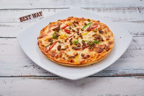 Minced meat, sojouk, pastrami, tomato, pepper, olives and mozzarella