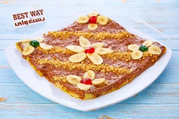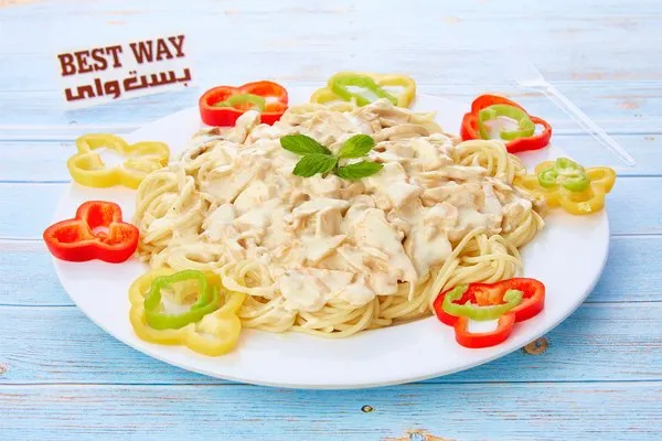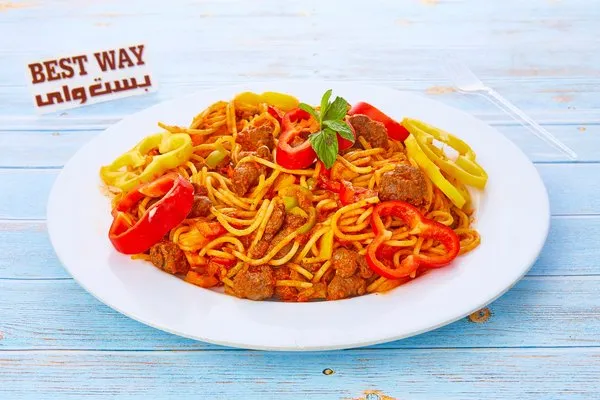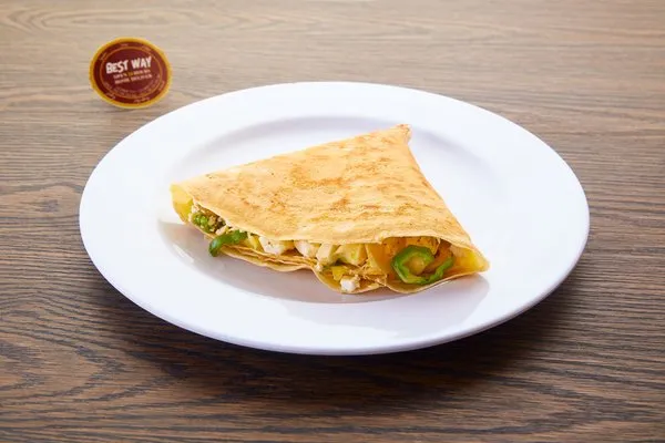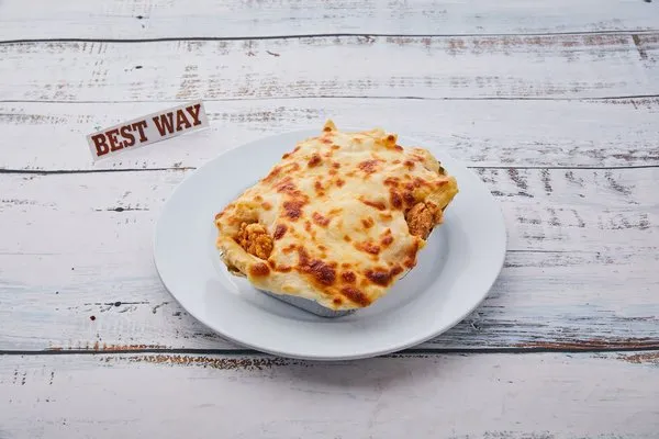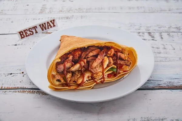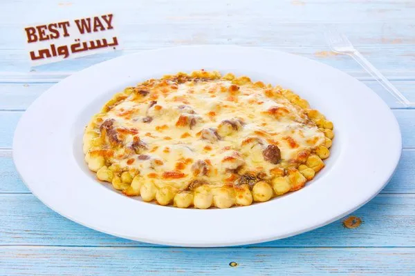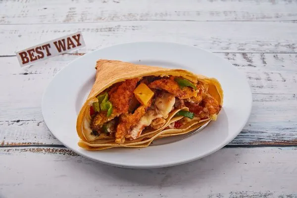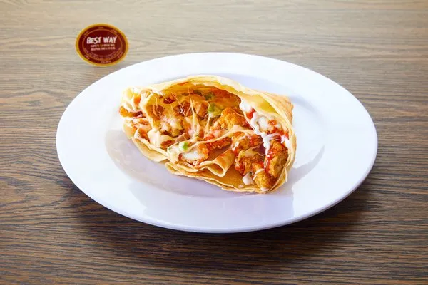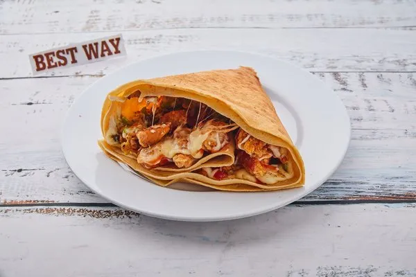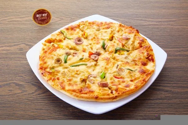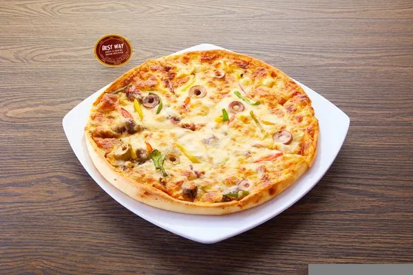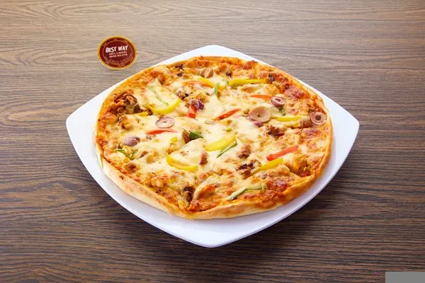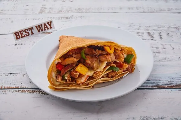 Chicken shawerma, mozzarella, chicken pieces, vegetables and strips