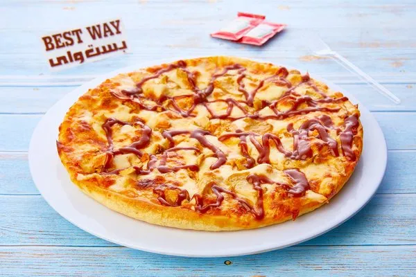 Chicken pieces, BBQ sauce, mozzarella, tomato, pepper and olives