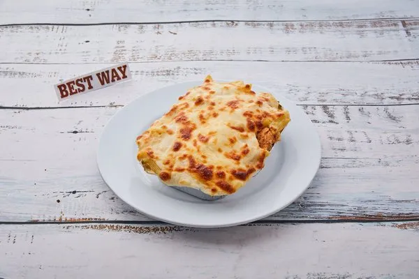 Panne, pastrami, tomato, pepper, olives and mozzarella