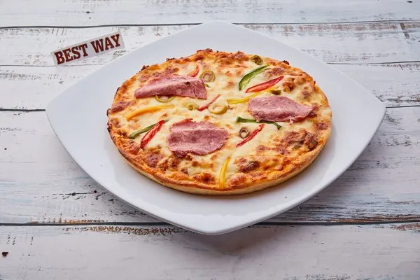 Smoked turkey meat, tomato, pepper, olives and mozzarella