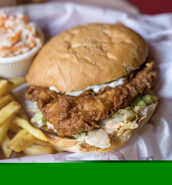 Fried chicken fillet, lettuce,cheese, tomatoes, pickles, BB mayo