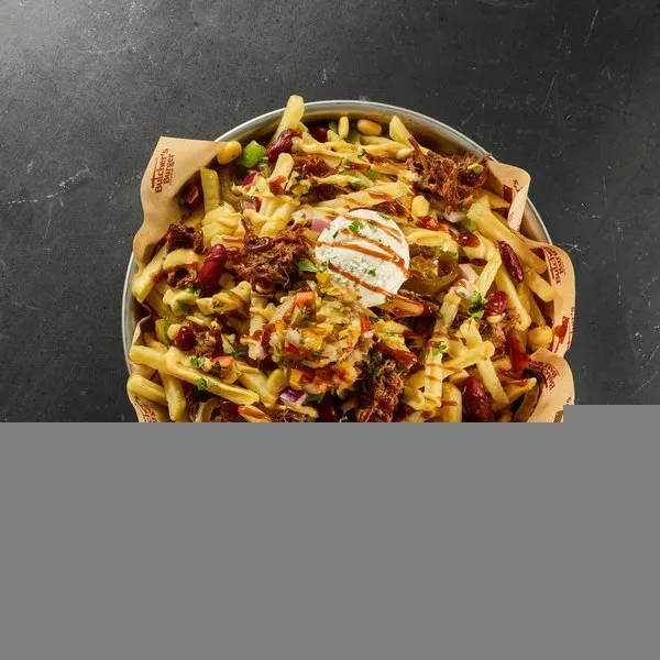 Generous portion of fries topped with chili con carne, cheese sauce, jalapenos, pico de gallo and sour cream
