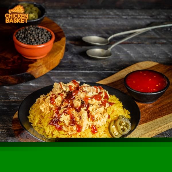 Classic Rizo Basket MealBasmati rice, chicken pieces, BBQ sauce |