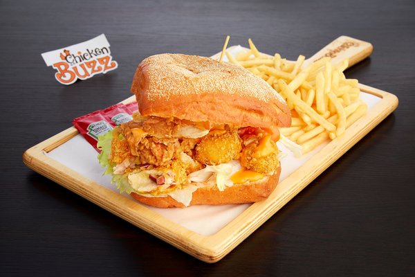 Mayo chili sauce, lettuce, tomato, crunchy chicken breast with spicy marinated, spicy fried cheddar sticks, cheddar cheese sauce, tomato, jalapeno pepper with smoked beef slices