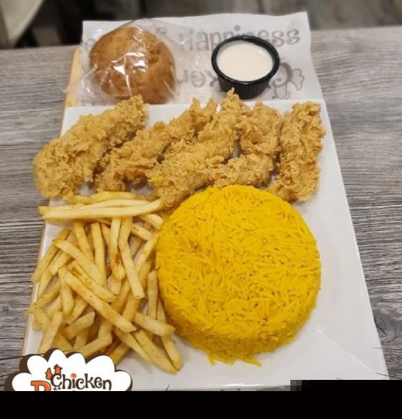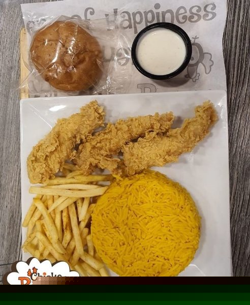Fries, cheddar cheese sauce, chicken tender strips, honey mustard sauce with bread piece and of your favorite juice