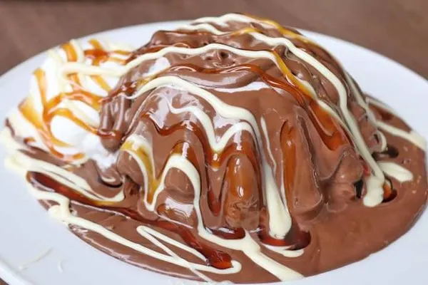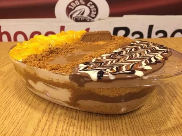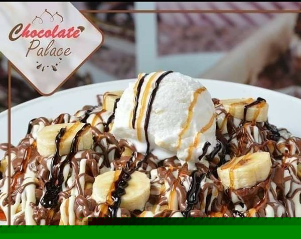 Waffle pieces, fruits ice cream, nutella, white chocolate, brown chocolate