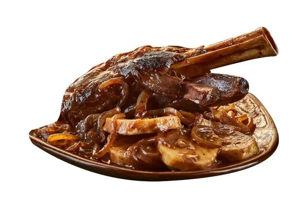 Slow cooked veal with dried apricot and prunes, served with boulangere potatoes