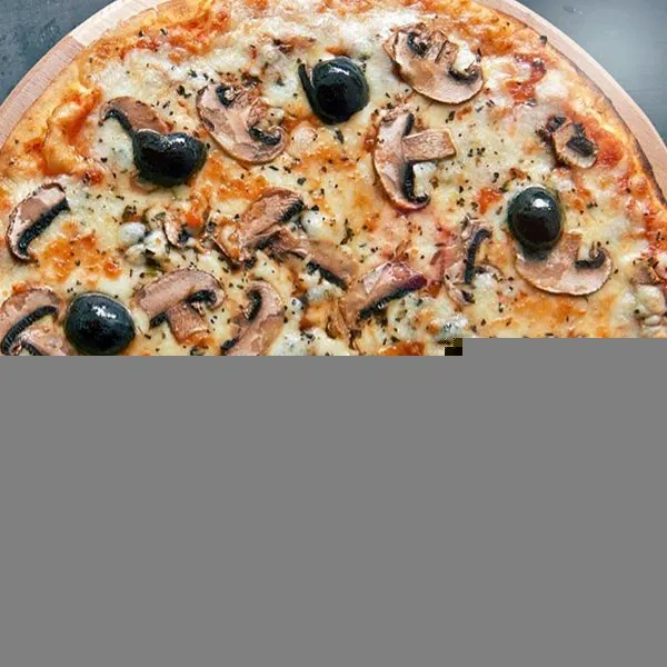 Mozzarella, tomato sauce, oregano, fresh mushrooms and olives