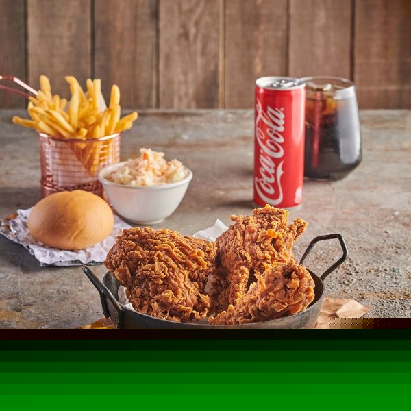 2 chicken pieces, 2 crispy strips, 1 mozzarella stick, 1 bomer, 1 onion ring, large fries, rice, coleslaw, bun, garlic dip and drink