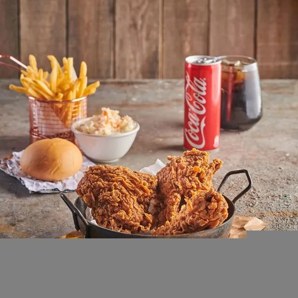2 chicken pieces, large fries, rice, coleslaw, bun, garlic dip and drink
