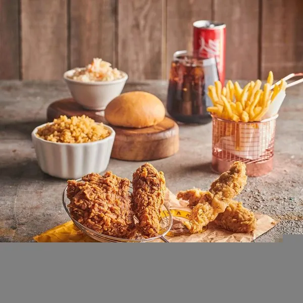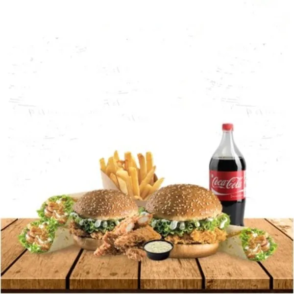 8 chicken pieces, 8 crispy strips pieces, 4 arizo, family fries, large coleslaw, 4 buns, large garlic dip and drink liter