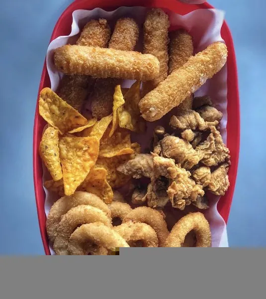 3 mozzarella sticks, 3 bomers, 10 onion rings, pop corn and doritos