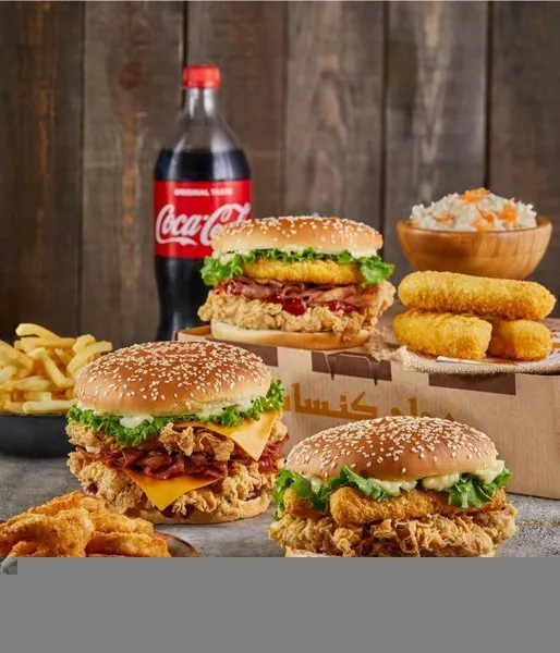 3 large pieces, 2 small pieces, 5 chicken strips pieces, 3 kansas wraps, 2 junior fillet sandwiches, family French fries, 5 bread, large coleslaw salad and family drink