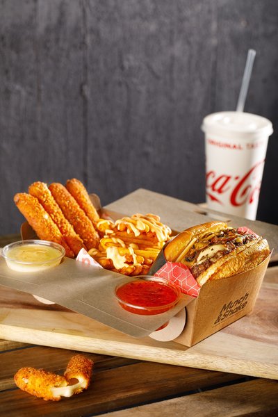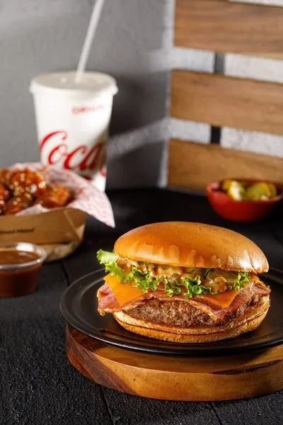 Original burger, smokey burger, shrooms burger, 8 wings pieces with dip of your choice and coca cola liter