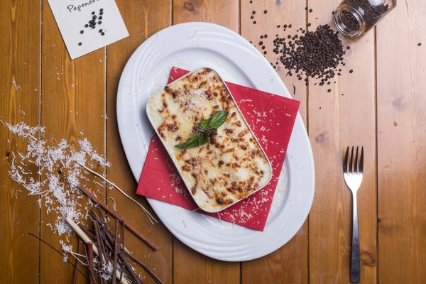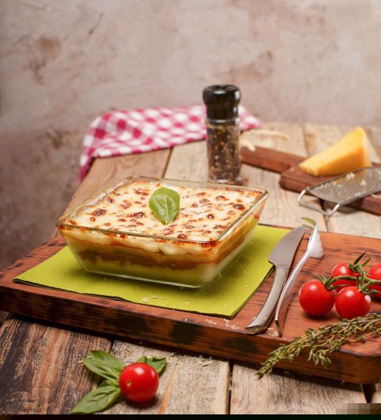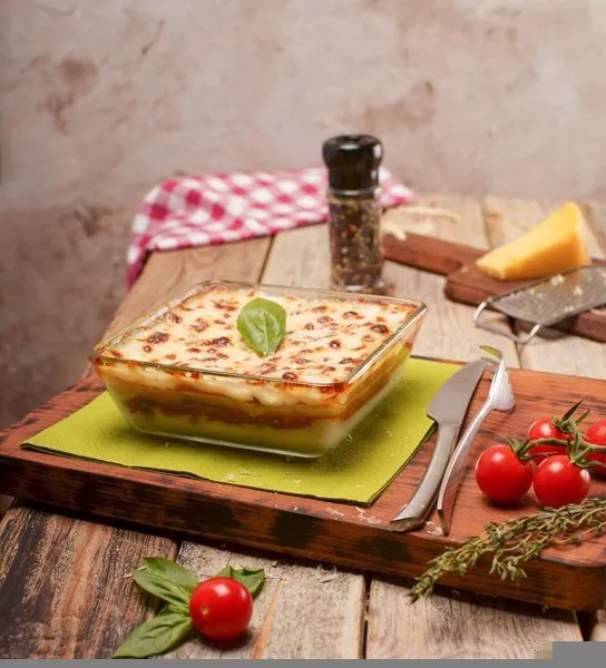 Homemade lasagna with tomato sauce, mozzarella, bechamel, minced meat and parmigano