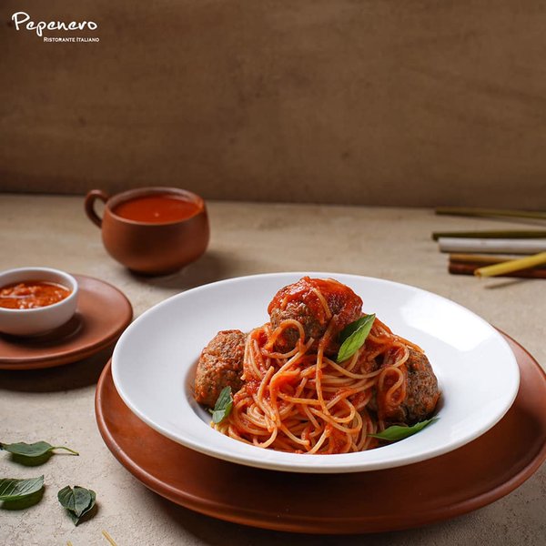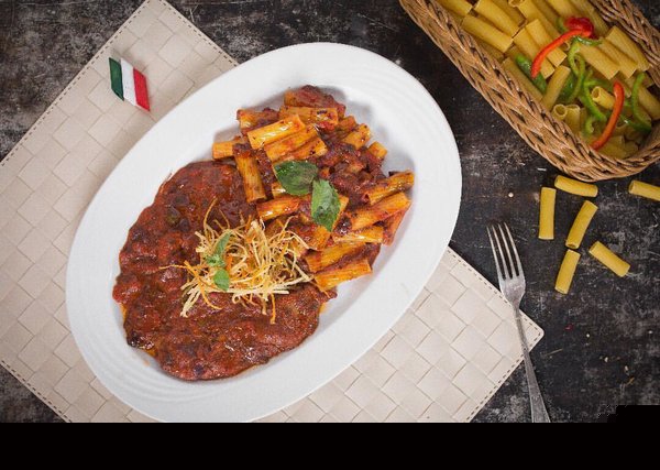 Homemade tagliatelle topped with tomato sauce and minced meat