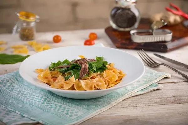 Farfalle pasta with cherry tomatoes, rucola and anchovies