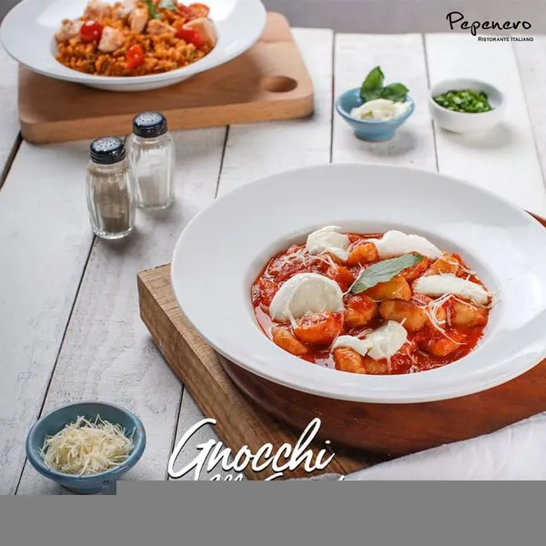 Homemade gnocchi with tomato sauce, mozzarella and parmesan cheese