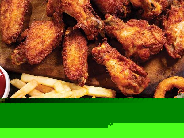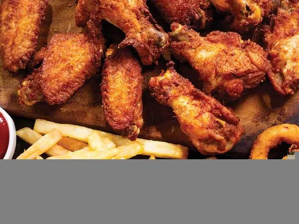 Fried chicken wings, with your choice of barbecue sauce, buffalo, roasted, with marinated fried onion rings or French fries, with three sauces, cowboy, ranch, thousand island