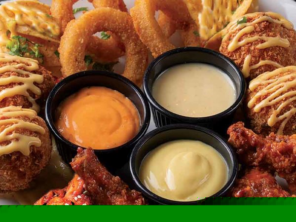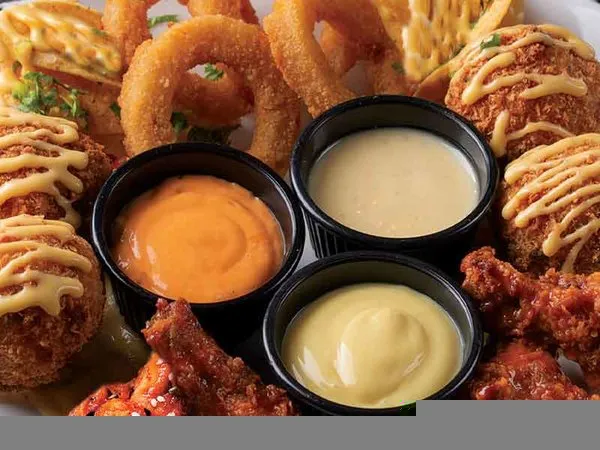 4 fried chicken wings with BBQ or buffalo or roasted sauce, fried onion rings, cheesy jalapeno, covered with cheese and 3 sauces cowboy, ranch & honey mustard