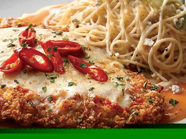A large piece of crunchy chicken breasts, cream of mushroom, melted cheese, pasta