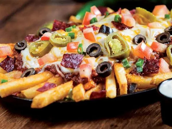 Fries with mozzarella cheese topped with melted cheddar cheese with tomatoes, jalapeno, olives, tomatoes, pepperoni slices, sliced green onions