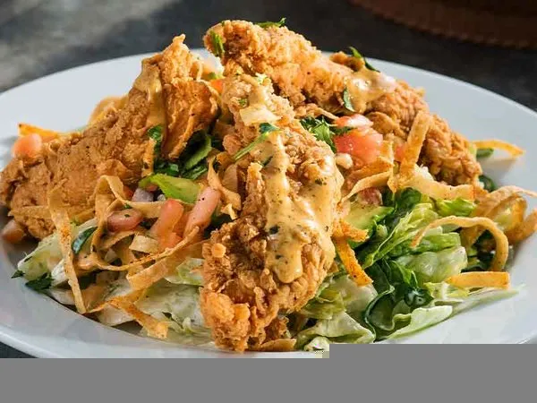 Crispy chicken slices, tortilla crunchy, lettuce, salad, pico de gallo salad, vinaigrette sauce