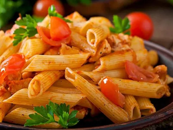 Penne pasta with chicken, shrimp and creamy lemon sauce with a mixture of dried tomatoes, mushrooms, green onions, cheese