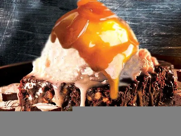 Brownies piece, ice cream, caramel sauce or chocolate ,nuts