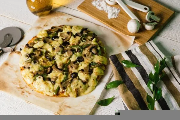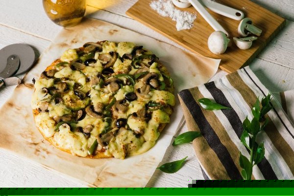 Mushroom, mozzarella, green pepper, black olives with pizza sauce