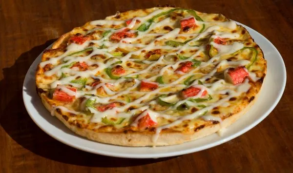 Shrimp, crab, mozzarella, green pepper, black olives, pizza sauce with ranch sauce
