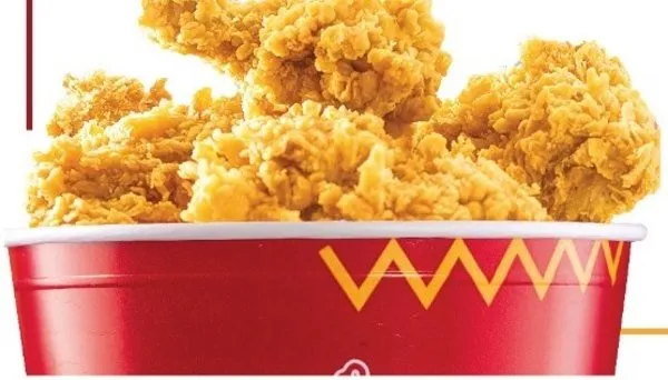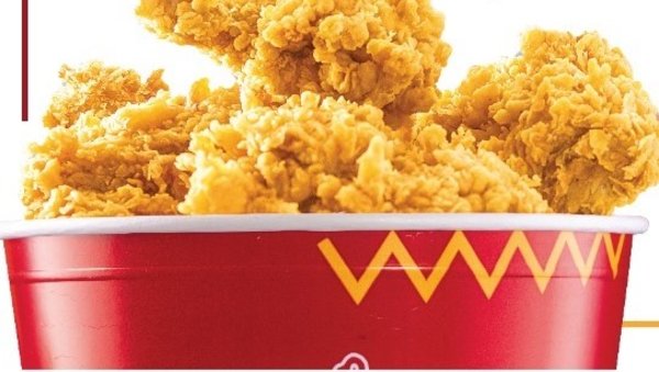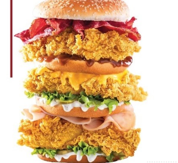 3 crispy chicken pieces, pickled cucumber, mayonnaise, lettuce, bacon, turkey, BBQ sauce, cheddar cheese, thousand island sauce, ranch sauce