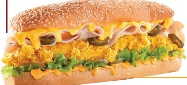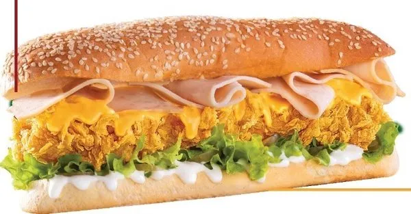 Crispy chicken stuffed with cheddar cheese and turkey, salami, lettuce, mayonnaise, pickled cucumber, ranch sauce and thousand island sauce served in baguette bread