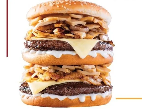 Beef burger topped with grilled onion, mushroom and mayonnaise, Swiss cheese