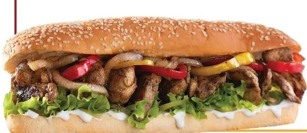 Chicken shish with mayonnaise, pickled cucumber, lettuce, onions, colored peppers and served in baguette bread