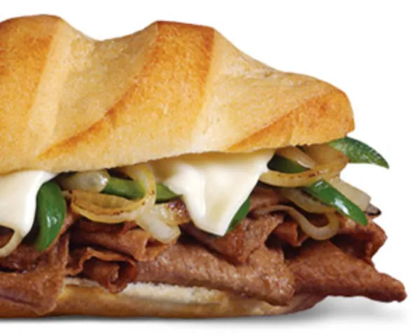 Steak slices, onion, green pepper and melted cheese
