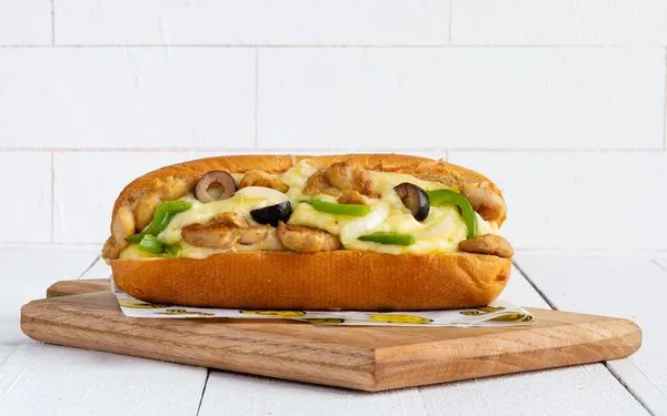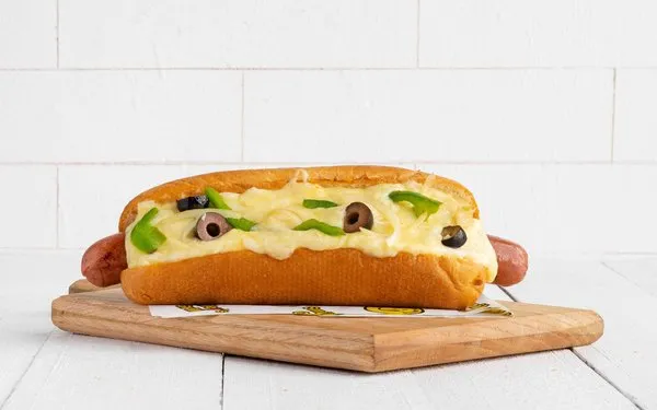 Hot dog sandwich served on Italian way with green pepper, olive, onion, spicy BBQ sauce covered with hot melted mozzarella cheese