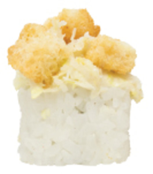 Crunchy bread, tempura chicken, avocado, parmesan cheese, lettuce, sushi rice