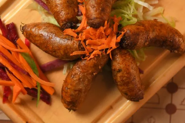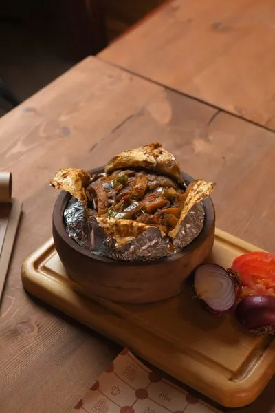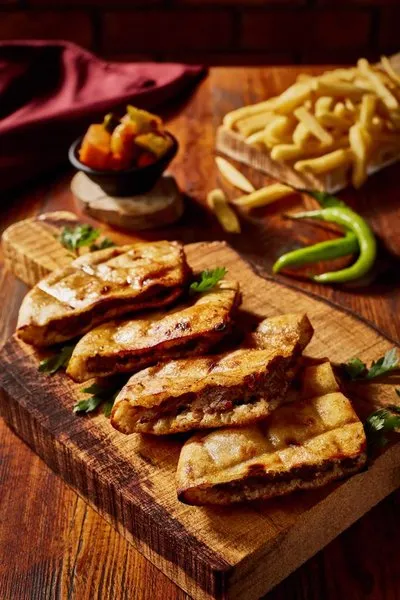 With vinegar, garlic, tomato sauce, baladi bread, veal mouza meat