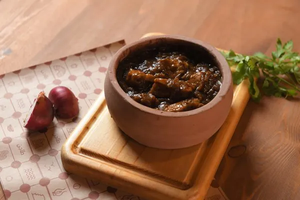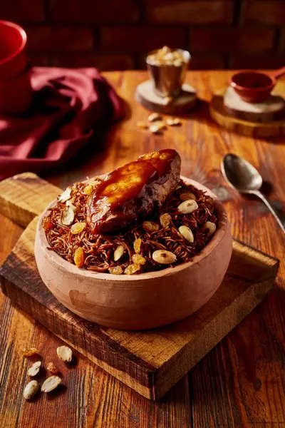 Egyptian rice cooked with butter, milk, qeshta, special spices, veal meat pieces