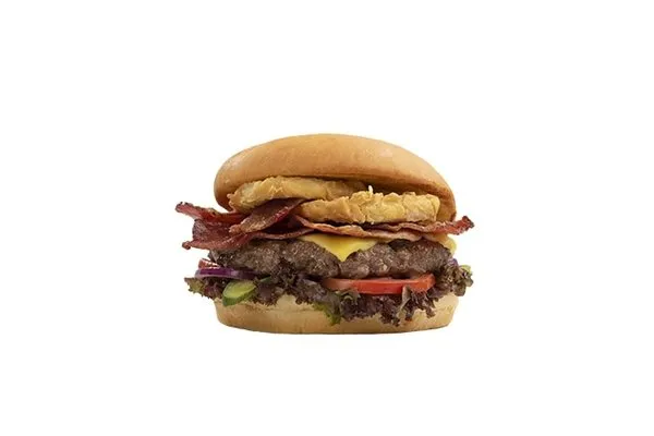 Burger with beef bacon, onion rings, cheddar cheese, BBQ sauce