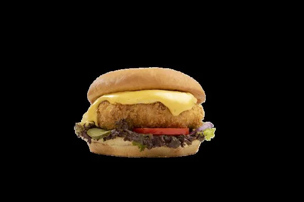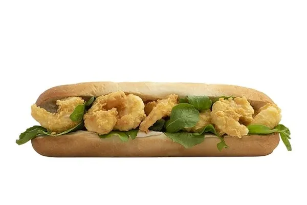 Burger with spicy shrimp, bacon, tomato, lettuce, mayonnaise
