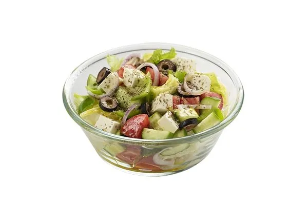 Iceberg lettuce, tomato, feta cheese, cucumber, bell pepper, onion, black olive, mixed with zesty dressing