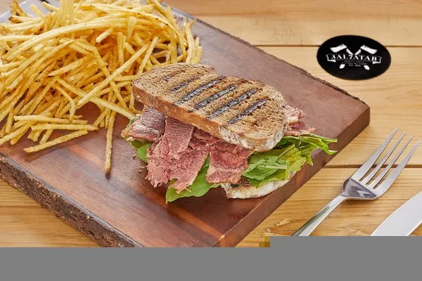 Home cured beef brisket slices, topped with arugula and Dijon mustard, served on toasted rye bread
