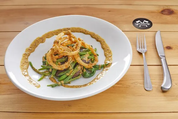 Our must try starter! On a bed of wilted spinach topped with sauteed green beans, fried onion rings drizzled with Dijon balsamic reduction